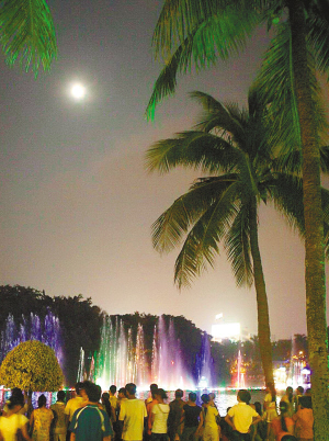 ↑海口市民从四面八方汇聚到海口人民公园东湖边,一边观看东湖喷泉,一边观看天上明月,尽情地享受中秋佳节的快乐。 本报记者 陈德雄 摄