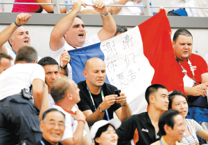 | 9月15日,在残奥会轮椅网球赛场上,法国球迷在国旗上用中文感谢志愿者。 新华社发 |