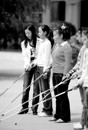 | 前不久,昆明市盲哑学校老师肖进(左一)在指导盲人学生定向行走(资料照片)。