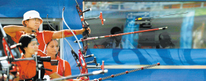 15日下午,北京残奥会射箭比赛现场,骄阳似火,但它比不过参加反曲弓团体比赛的中国姑娘给全场观众带来的热浪。