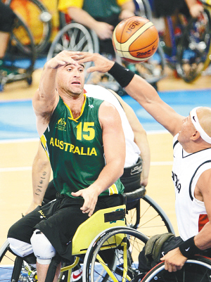 9月16日,在北京残奥会轮椅篮球男子决赛中,澳大利亚击败加拿大队,夺得冠军。图为澳大利亚队球员布拉德·内斯(左)在传球。 新华社发