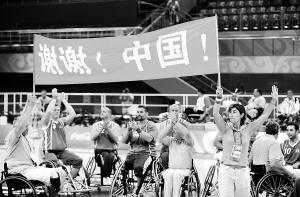 瑞典轮椅篮球队以及伊朗七人制(脑瘫)足球队都曾在赛场打出“谢谢中国”的标语。 伊朗足球队队员马希尼告诉记者:“这个条幅主要表达了我们对中国的感情,因为中国人民在这几天的比赛中对我们太热情了。”国际残奥委会主席菲利普·克雷文在残奥会闭幕当天也表示,两个奥运,同样精彩;为此“我也想感谢中国政府、北京市政府、北京奥组委以及残奥会的三个赛区的所有有关人员,感谢你们”。