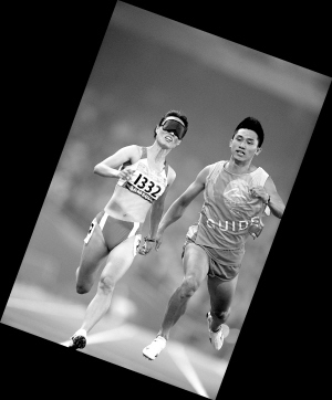 | ↓9月16日,中国选手吴春苗(左)与领跑员在比赛中。 |