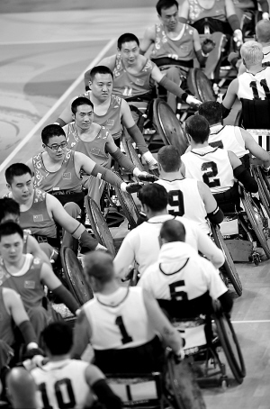 9月12日,在残奥会轮椅橄榄球预赛中,中国队球员与美国队球员赛后相互致意。 残疾人运动员在友爱与融合中实现超越,全世界关心北京残奥会的每个人都在和他们分享令人类骄傲的精神力量。
