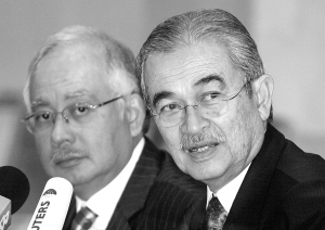 巴达维表示 可能会提前移交权力 9月17日,马来西亚总理巴达维(右)和副总理纳吉布在马来西亚联邦政府总理办公室出席新闻发布会。当日,巴达维表示自己很可能会提前将马来民族统一机构(巫统)主席及执政党联盟国民阵线(国阵)主席的职权移交给纳吉布。此前,巴达维曾表示将于2010年年中移交权力。 新华社/法新