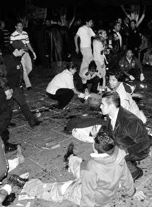 11时45分许,广场人群中突然传出巨响,3枚扔向人群的手榴弹炸响,包括儿童在内的众多平民或死或伤。
