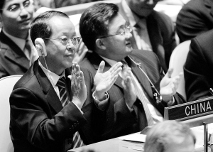 9月16日,在美国纽约联合国总部,中国常驻联合国代表王光亚(前左)在第63届联大第一次全会上鼓掌。第63届联合国大会会议当日下午在纽约联合国总部拉开帷幕。 新华社记者侯俊摄
