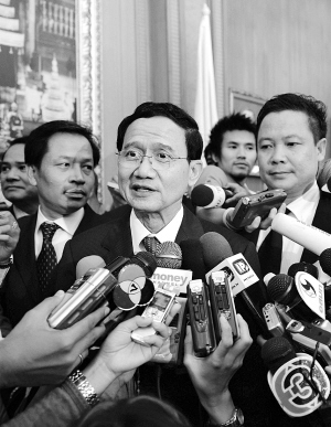上图:颂猜(中)当选总理后接受记者采访。 新华社记者 陈铎 摄