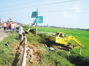 上午9时许,记者赶到事故现场时,交巡警已做完现场勘察,清障车正准备将平板卡车拖走。路上满是玻璃碎片,约30米长的护拦被撞断,“矿泉与新坡镇出口500米”标志牌的两根水泥杆被撞断。平板卡车的车头右侧塌陷,原本载在平板卡车上的钩机扎进农田里。工程运输车车头部位严重受损,停在平板卡车的前方。