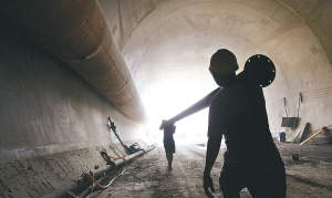 9月16日,在位于三亚市田独镇的东环铁路芭蕉岭隧道内,工人正在搬运输水管。 海南东环铁路工程全线18座隧道中,由中铁三局承建的有11座,总长12050米,已全部开工。截至8月底中铁三局已完成隧道工程2487米,完成设计总量的20.64%。 本报记者 宋国强 通讯员 李世伟 摄