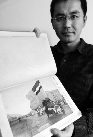 9月17日,王锦思展示一本日本侵华战争时期的画册。 当日,在“九·一八”事变77周年纪念日来临前夕,一批反映日本侵华战争的珍贵历史照片在吉林省长春市首次公开。这批历史照片共15张,是照片收藏者王锦思于2008年春天辗转从日本收藏者手中购得。据介绍,这些照片是日本侵占长春时期拍摄,拍摄时间大概在1937年前后,反映了长春当时的城市面貌,并且每张都附有日文图片说明。此外,王锦思还展示了《新满洲国写真大观》图片集、《满洲旅行》相册、日本军帽等。 新华社记者 邵守志 摄