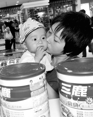 9月17日,一名妇女带着孩子在银川市新华百货连锁超市东方红店内的三鹿奶粉召回点退货。 新华社记者 刘泉龙摄