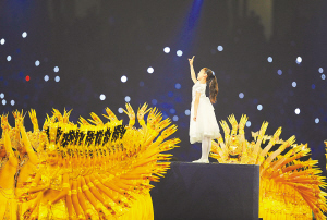 “鸟巢”内灯光渐明,小女孩身旁围绕着6组“千手观音”,共计126名演员摆出的造型,像闪烁的太阳光芒,优美的手姿表达出圣火永在人们心中燃烧的真情。