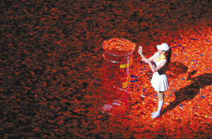 扮作卡通娃娃的盲人孩子来到鸟巢草坪中央,他们仿佛来到宇宙天穹,仿佛能看到满天星斗。孩子们欣喜地摘下一颗颗星星,播洒在大地上,而这便成为他们永远的光明。
