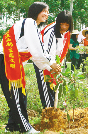 9月18日,儋州市植树造林共建西部生态文明统一行动正式启动。图为儋州市中等职业学校的志愿者参加植树。 本报记者 李英挺 摄