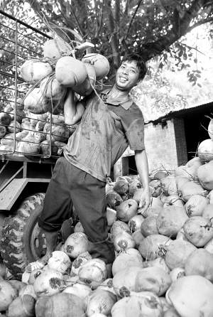 | 这位长期在农村收购椰子的商贩说,往年每天能收两三车,今年每天只能收一车。 本报记者 苏建强 摄 |