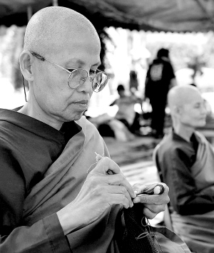 9月20日,在泰国首都曼谷的总理府,一名参加反政府组织人民民主联盟(民盟)集会的僧侣在做针织活。泰国警方当天称不会使用武力来驱散总理府内的示威者。鉴于民盟的示威者尚未从总理府撤出,泰国看守内阁会议日前批准对曼谷廊曼机场进行修缮并将其作为临时总理府。 新华社发
