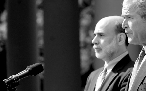 ↑ 9月19日,在美国华盛顿白宫,美国总统布什(右)发表经济方面的讲话。旁边的是美联储主席伯南克。布什说,为了结束目前这场几十年来最严重的金融危机,联邦政府干预金融市场不仅有正当理由,而且必要。 新华社/法新