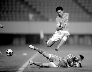 | 9月20日,中超联赛第17轮比赛中,山东鲁能队主场以2:0战胜北京国安队。图为北京国安队球员杨璞(下)在比赛中铲断山东鲁能队球员吕征的进攻。另外两场比赛,陕西队1:0武汉队,广州队1:0深圳队。 新华社发 |