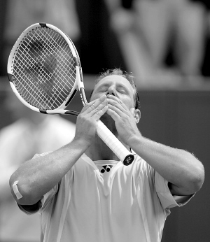 | 网球戴维斯杯半决赛20日点燃战火,首日比赛结束,阿根廷队以2:0领先俄罗斯队,西班牙队2:0领先美国队。图为阿根廷选手纳尔班迪安在比赛结束后庆祝胜利。 新华社发 |