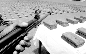 9月20日,在哥伦比亚考卡山谷省的卡利,一名士兵守卫缴获的2吨大麻。这批大麻是哥军方在西部城镇佛罗里达的一艘货船上缴获的。 新华社/法新