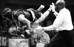 第四届世界杯武术散打比赛21日晚在哈尔滨结束,中国队摘取17枚金牌中的11枚。图为中国选手于飞彪(下)在60公斤级比赛中夺冠。 新华社发