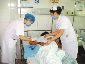 | → 9月21日,深圳市龙岗区人民医院的医护人员在给一名烧伤者换药。 新华社记者 王传真 摄 |