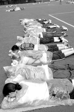 9月20日,杭州市保俶塔实验学校学生在操场上进行隐蔽演习。当日是全民国防教育日,上午10时,杭州市拉响防空警报并举行街道社区人员、学校师生防护疏散隐蔽演习。 新华社发(胡冠华 摄)