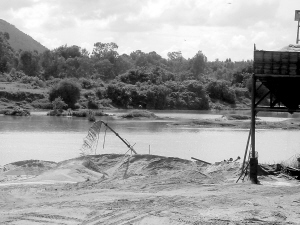 南渡江新坡段采砂场正在采砂。砂价暴涨已引起省政府有关部门关注。 吴棉 摄