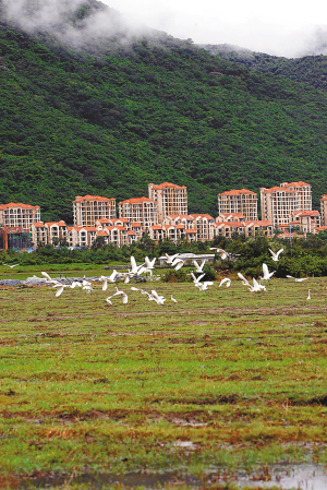 9月21日上午,雨后的亚龙湾畔空气清新、景色秀丽,觅食嬉戏的鹭鸟更为这幅田园风光增加了一份怡然。 本报记者 程范淦 摄