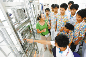 | 技校教师正在指导学生了解电梯的运行原理。 本报记者 程范淦 摄
