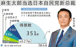 负责自民党选举的官员臼井日出男说,自民党国会参众两院议员以及地方支部代表当天的投票结果显示,麻生赢得527票中的351票,以绝对优势当选为自民党新一任总裁。