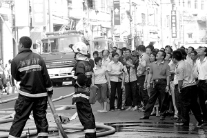 据现场指挥灭火的长堤消防中队邱指导员介绍,消防官兵赶到现场时,大火已经蔓延到整个楼层,屋内一片通红。失火楼房正位于博爱北街的中间位置,周围遍布商铺,而且消防设施老化陈旧。根据现场情况,消防官兵马上组织两侧楼房的居民离开房屋,并架起多个水管向失火处喷水。