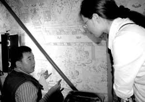 敦煌壁画保护修复现场开放受到游客欢迎。9月22日,在莫高窟98窟内,敦煌研究院保护人员(左)正在向一名游客讲解如何修复壁画。 新华社发