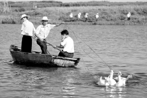 湖边的草地周围,政府工作人员来回巡视,一只小船则在湖面巡察。6只大鹅也被投进湖中,并固定在水中的柱子周围。