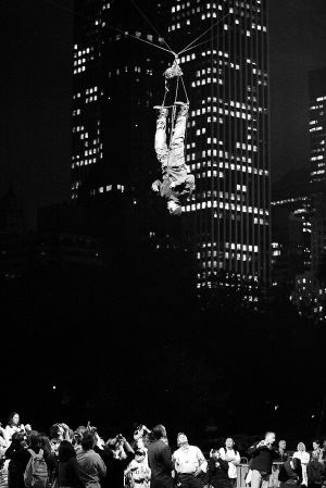 9月22日,美国魔术师戴维·布莱恩(上)在纽约中央公园开始进行60小时的倒挂特技表演,挑战人类极限。整个表演期间,布莱恩将不会进食也不会睡觉,只会用吸管摄入液体,并利用导液管排尿。 新华社/法新