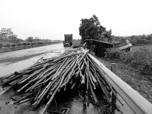 记者早上赶到现场,道路已经恢复畅通,交警部门在道路上设置了警示标志。路边散落着一些汽车零件和木料(见上图,李关平 摄),高速围栏杆被撞出了近10米的口子,两辆大型运输车前后相连,侧翻并陷进在农田里。其中,在前面的运输车上运载的是满车的木料,后面的运输车上满载的石料全部倒进农田里,车头已经扭曲变形。停在路边的一辆皮卡车的后车厢也被撞凹进去。