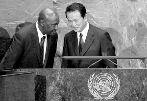 9月25日,在美国纽约联合国总部,参加联大一般性辩论的日本首相麻生太郎(右)用日语讲了几分钟后被告知大会的日语翻译还没就位。直到日语翻译就位后,麻生太郎才继续演讲。当日,第63届联大一般性辩论进入第三天。 新华社记者 侯俊 摄