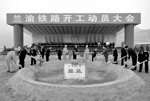 | 九月二十六日,中共中央政治局委员、国务院副总理张德江(中)在国务院有关部委、重庆市、四川省、陕西省、甘肃省有关负责同志陪同下为兰渝铁路奠基。 新华社记者 韩传号 摄 |