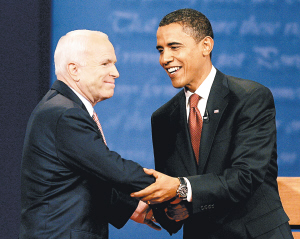 | 九月二十六日,麦凯恩(左)与奥巴马在首场辩论之前握手。 新华社/路透 |