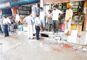 9月27日,在印度首都新德里南部的一个市场,当地居民在爆炸现场查看情况。当天,该市场内发生一起炸弹爆炸事件,造成至少1人死亡、17人受伤。 新华社/法新