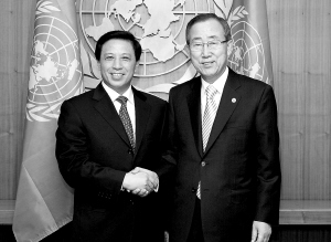 我新任常驻联合国代表 向潘基文递交全权证书 9月26日,在美国纽约联合国总部,中国新任常驻联合国代表张业遂(左)向联合国秘书长潘基文递交全权证书后与潘基文握手。 新华社记者 侯俊 摄