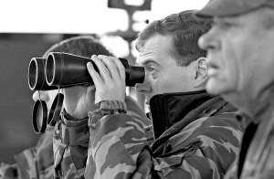 | 9月26日,俄罗斯总统梅德韦杰夫(前)在奥伦堡附近的一个军事试验场视察。当天,梅德韦杰夫在奥伦堡会见各军区司令时说,俄罗斯在2020年前将全面保障军队完成核遏制任务,并装备成套的最新式武器。 新华社/法新 |