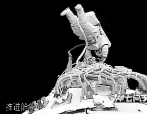 像一个从水中慢慢上浮的潜水员,中国航天员翟志刚头先脚后,出现在太空之中。