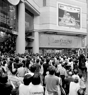 9月27日,香港市民和游客通过香港街头的大屏幕,关注神七航天员出舱行走。 新华社记者 周磊 摄