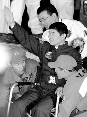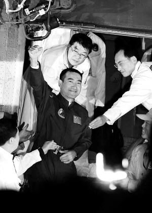 大约5分钟后,翟志刚带着笑容,身着乳白色航天服出现在舱口。从他入选神五乘组开始,翟志刚的笑容总是那么充满阳光。刘伯明也出来了。最后出来的是景海鹏。