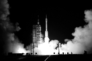 | 九月二十五日二十一时十分,长征二号F型运载火箭点火,神舟七号飞船在酒泉卫星发射中心升空。 (新华社资料照片) |