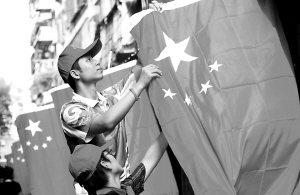 9月28日,共青团海口市委组织的数十名北京奥运志愿者扛着数百面五星红旗来到海口大同里布艺一条街,将街面装饰得五彩缤纷,国庆的喜庆气氛洋溢在每个人的心头。 本报记者 苏建强 摄