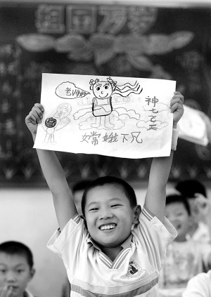 9月26日,“神七飞天、嫦娥下凡”,一幅稚嫩蜡笔画跃然图画纸上。 海口市第二十七小学3年级1班全体同学,在美术老师的指导和启发下,绘出了祝贺“神七飞天”、畅想“神八飞天”、盼飞天英雄凯旋等10几个命题图画作品。 本报记者 苏晓杰 摄