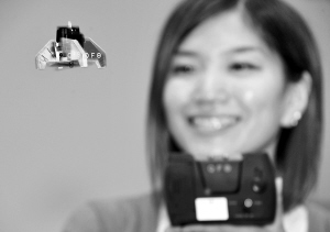 9月28日,日本TOMY玩具公司的职员在首都东京展示微型飞行玩具“QFO”。这种世界上最小的红外遥控飞行玩具尺寸为65毫米X65毫米X43毫米,仅重9克。“QFO”底部装有机械装置,可像飞碟一样飞行。 新华社/法新
